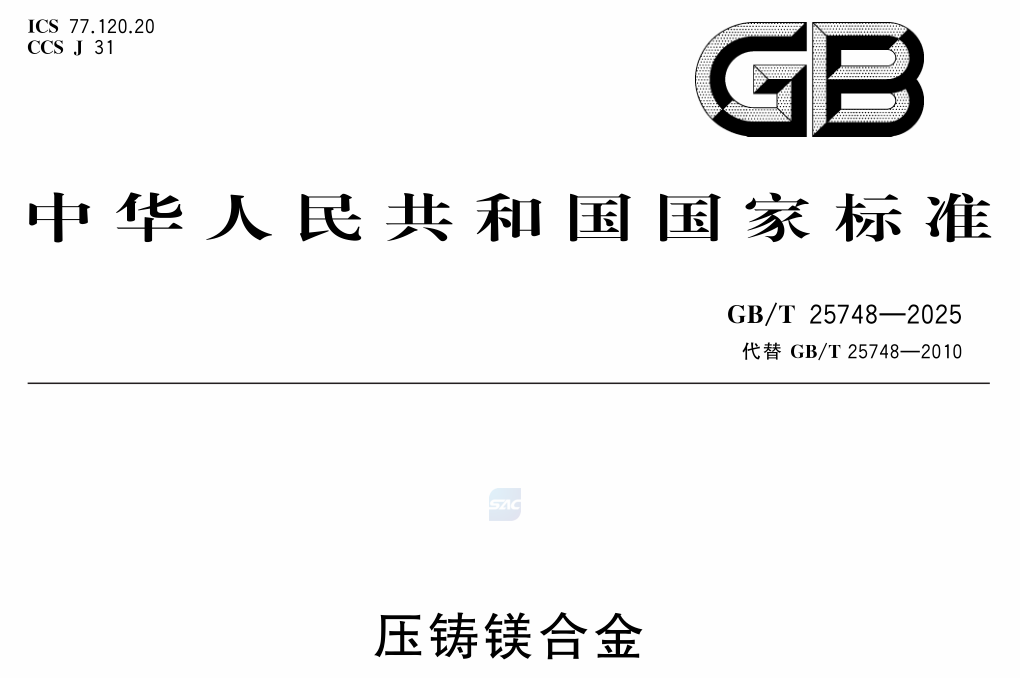 2025年12月2日,国家市场监督管理总局、国家标准化管理委员会联合发布了 GB/T 25748-2025《压铸镁合金》国家标准。