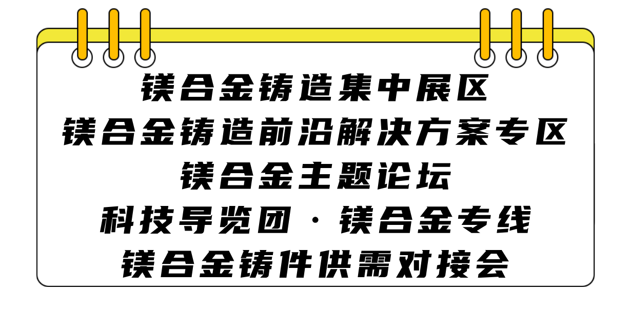 镁合金铸造专题活动 本届展会将继续加码,以N4主题馆为核心,围绕镁合金主题重磅打造多项专业内容。 镁合金铸造集中展区 产业链代表性铸件、模具、设备品牌集中展出,发挥集群效应精准引爆专业关注。
