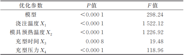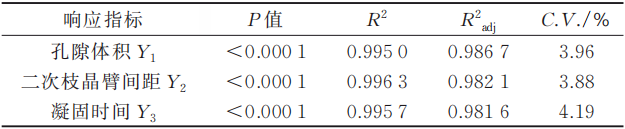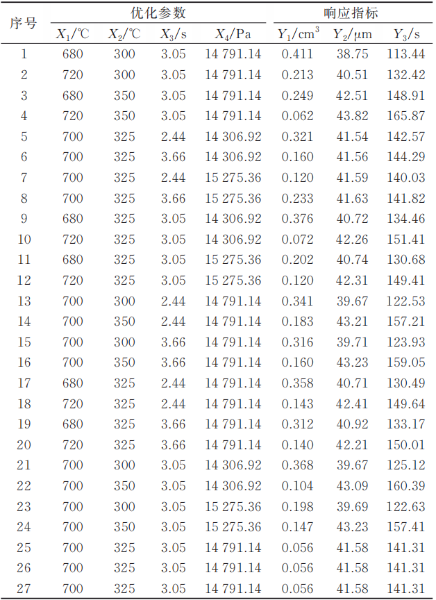 图4 初始方案的数值模拟结果 在低压铸造中,铸件缺陷主要包括气孔、裂纹,缩松和缩孔等。在数值模拟中,通常是将铸件内部孔隙体积,二次枝晶臂间距和凝固时间作为铸造工艺的评价指标。其中,孔隙体积和凝固时间都可以直接得到,而二次枝晶臂间距则需要在view模块中调用result选项中的Metallurgical Tools功能,通过输入金属液的固、液相线温度进行计算得到,一般是以二次枝晶臂间距的最大值作为评价值。另外,低压铸造中涉及到的工艺参数较多,有升液时间、升液压力、充型时间、充型压力、增压时间,增压压力、保压时间、保压压力、浇注温度和模具预热温度等。其中,浇注温度和模具预热温度对上述3个评价指标均有直接影响,而充型时间和充型压力也是影响金属液充型性能的两个重要参数。所以,本研究以浇注温度(X1)、模具预热温度(X2)、充型时间(X3)和充型压力(X4)作为优化参数,以孔隙体积(Y1)、最大二次枝晶臂间距(Y2)和凝固时间(Y3)作为响应指标,通过Design-Expert软件进行三水平Box-Behnken响应面试验设计,并通过试验结果分析各参数对响应指标的影响程度。响应面试验具有精度高、成本低等特点,不仅可以分析单个因素对响应指标的影响,还可以分析双因素对响应指标的影响。此外,响应曲面法还能够处理实际问题中的不确定性和变异性,进一步提高过程优化的可靠性。响应面试验因素-水平表见表3。 响应面试验设计共27组,其中浇注温度和模具预热温度的范围可通过现有研究及生产经验确定。27组试验的数值模拟结果见表4。 表3 响应面试验因素-水平表