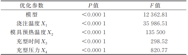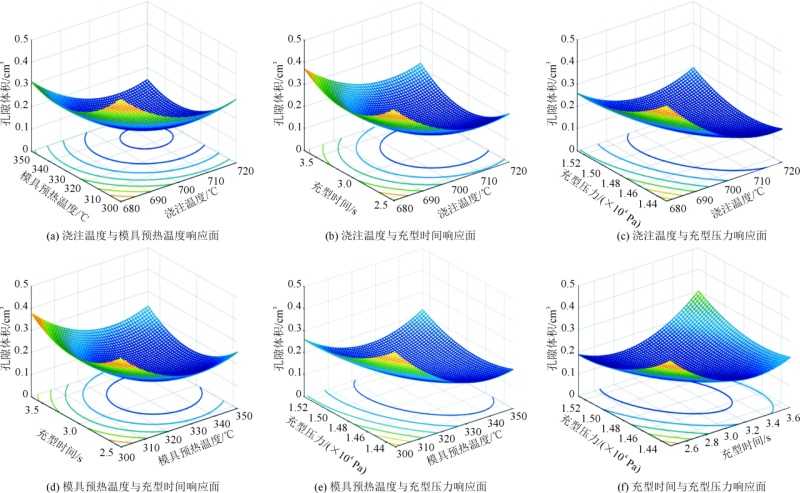 根据上述27组数值模拟结果得到的关于响应指标的响应面模型拟合参数见表5。通过这些参数可以确定拟合度最高的响应面模型。根据拟合参数确定响应指标的响应面模型为二阶响应面模型。表5中的P值、R2和R2adj都是用来判断响应面模型与模拟数据的拟合程度。当P值小于0.05时,可认为响应面模型与模拟数据之间的误差较小。R2为多重判定系数,当R2≥0.8时,可认为该响应面模型可用,R2越接近1,响应面模型的拟合度越高。R2adj为调整后的多重判定系数,通常作为最终判定系数。C.V.为变异系数,若该值大于15%,则需要考虑是否存在异常数据。从表5中可以看出,二阶响应面模型与模拟数据拟合度较好,可以用该模型继续进行响应面试验。 孔隙体积的显著性分析见表6。表6中的P值反映了各优化参数对响应指标的影响显著性。当P值小于0.05时,表示该参数对响应指标影响显著;当P值小于0.01时,表示该参数对响应指标影响高度显著。F值反映了各优化参数对响应指标的影响程度,F值越大,则影响程度越大。从表6中可知,4个优化参数对孔隙体积的影响都是高度显著,其中浇注温度与模具预热温度的影响程度最大。孔隙体积的双因素交互作用三维响应面图见图5。 表5 二阶响应面模型拟合参数