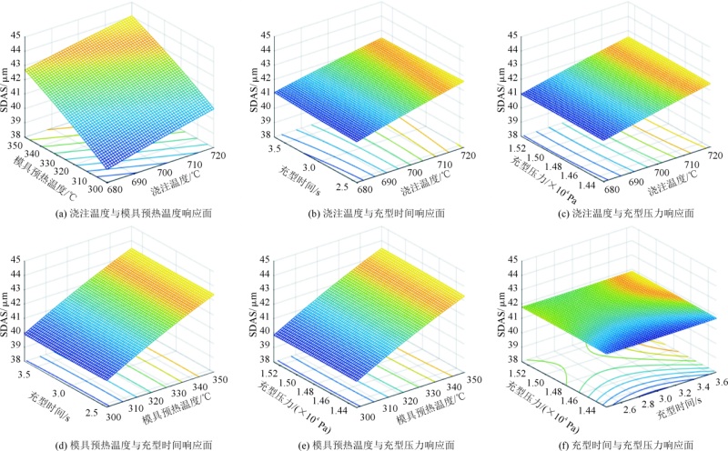 图5 孔隙体积的双因素交互作用三维响应面图 SDAS的显著性分析见表7。从表7中可知,充型时间和充型压力对SDAS的影响程度低于浇注温度和模具预热温度。SDAS的双因素交互作用三维响应面图见图6。凝固时间的显著性分析见表8。从表8中可知,模具预热温度的影响程度最大,浇注温度次之,充型时间的影响程度最小。凝固时间的双因素交互作用三维响应面图见图7。可以看出,温度对凝固时间的影响最显著,浇注温度和模具预热温度越高,凝固时间越长。而当充型时间越长或充型压力越小时,凝固时间随之增加;当充型时间越短或充型压力越大时,凝固时间随之增大。 表7 SDAS的显著性分析