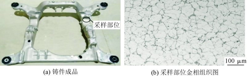 图8 铸件成品及金相组织图 结论 (1)由响应面法分析可知,对于孔隙体积而言,浇注温度、模具预热温度、充型时间和充型压力过高或过低都会导致孔隙体积增加;对于SDAS而言,浇注温度和模具预热温度对其影响程度较大,会随着浇注温度和模具预热温度的升高而增加;对于凝固时间而言,其会随着浇注温度,模具预热温度和充型时间的增加而增加,随着充型压力的增加而减小。 (2)根据响应面法得到的优化目标函数,并通过遗传算法寻找最优参数组合。计算后得到的优化后的参数组合是浇注温度为707.89 ℃,模具预热温度为329.61 ℃,充型时间为3.06 s,充型压力为14 822.30 Pa。相比于初始方案,孔隙体积减少了51%,铸件质量明显提高。SDAS和凝固时间也略有减少。对优化方案进行生产试制并进行采样试验,验证了铸件质量符合使用要求,证明了该优化方案的可行性。 《A356铝合金后副车架低压铸造工艺参数的设计与优化》