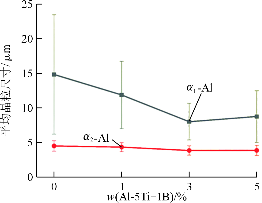 图6 不同Al-5Ti-1B含量的TiB2/ADC12铝合金α1-Al和α2-Al平均晶粒尺寸