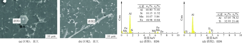 图4 Al-5Ti-1B中间合金微观组织 图5为添加不同含量Al-5Ti-1B中间合金的TiB2/ADC12铝合金典型金相组织。图6为α-Al晶粒尺寸统计。图7为添加不同含量Al-5Ti-1B中间合金的TiB2/ADC12铝合金的SEM形貌。图8为图7局部区域对应的放大形貌及EDS能谱。由能谱分析可知,粗大块状相主要含Fe、Mn和Si等元素,针状相主要包含Al和Ti元素,推测针状相主要是凝固过程形成的Al3Ti相。结合相关研究分析可知,块状相主要是α-AlFeMnSi相。以上结果表明,Al-5Ti-1B可以形核细化α-AlFeMnSi相。