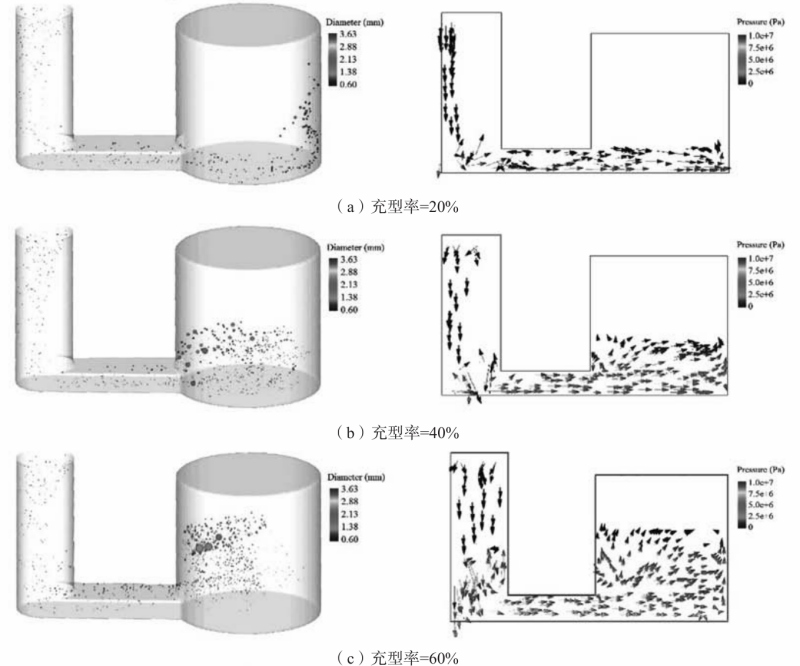 图6 渣气复合体粒径分布和流场 图6a、b为充型初始阶段,外部引入的渣粒随金属液快速进入型腔中,此时在浇注系统中的渣粒体积变化不大,且呈弥散形分布,而在圆柱试样上层液面区域开始出现粒子的聚合长大。其原因是由于直浇道和横浇道区域的流速较大,渣粒之间的聚合长大不明显。而在试样上部液面区域的流速显著降低,使得渣粒之间的碰撞聚合长大较为明显。由于充型初期金属液温度变化不大,在此期间氢气在渣粒表面的吸附量也较小,在这个阶段中渣气复合体的体积变化主要是以渣粒间的聚合长大为主。图6c-e为充型中后期阶段,直浇道与横浇道内的流速有所减缓,可以看到因渣气复合而形成的粒子体积增加。同时内浇口区域的流速显著降低,这使得该区域开始出现渣气复合体的快速聚合长大(图6e)。在此期间,渣气复合体不断向上方运动,其聚合体积进一步加大,从而在试样顶部可以看到有较多大体积的渣气复合体的存在。图6f表示完全凝固后渣气孔的分布,从图中可以看到,直浇道和横浇道内的渣气复合体体积有了明显的增加。同时,试样顶部的渣气孔分布也较为明显,且体积较大,而试样中下部区域的渣气孔数量较少,且体积较小。其原因是由于在凝固阶段金属液温度不断降低,促使熔体中的氢大量析出并吸附于渣粒表面,渣气复合体中氢气含量的不断上升使得其密度减小,促进了渣气复合体向试样上部的移动。与试验结果对比,模型计算所获得的渣气孔分布规律及形貌特征与实际基本吻合。 2.4 夹渣对渣气孔形成的影响 为了研究外来夹杂的引入对铸件中渣气孔形成和分布的影响,采用相同的工艺条件分别计算了无夹渣和有夹渣进入的条件下铸件内气孔和渣气孔的分布,结果如图7所示。