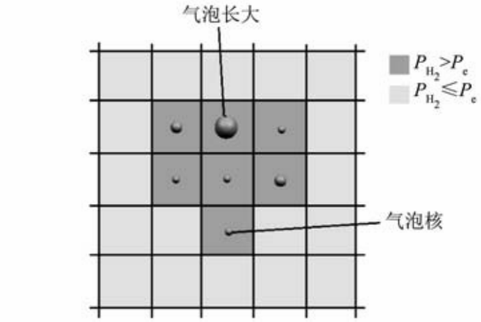 图1 氢气形核网格模型 当网格内的氢分压PH2大于此处最小形核压力Pe时,在该网格区域中形成一个具有初始半径的氢气泡核,温度不断下降使得网格内氢溶解度下降,气泡核不断吸收析出氢后体积增大,其气泡体积可表示为: