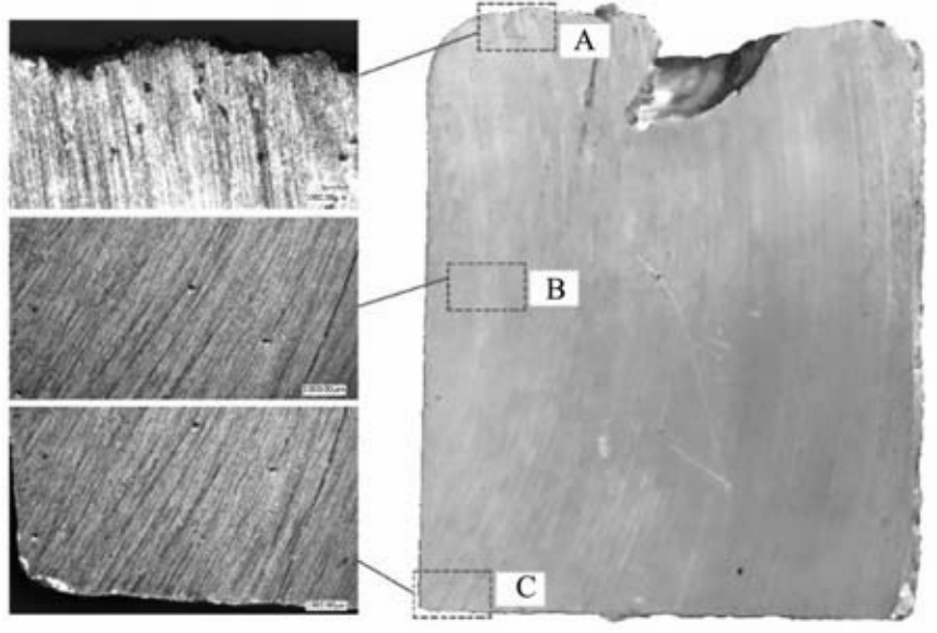 图3 试样模型及尺寸图 2.2 渣气孔的分布与三维形貌 图4 为圆柱试样纵截面照片,对试样的顶部(A)、中部(B)和底部(C)区域进行渣气孔分布分析。