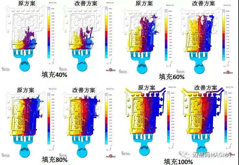 图6:方案改善图 改善方案的CAE分析 我们把改善方案放在MAGMA软件中进行CAE模拟,通过分析原来方案与改善方案填充的40% ,60% ,80% ,100%的模拟结果对比,可以判定:经过修改浇道后,产品左半边填充速度比原来快了,并且左半边和右半边填充趋向平衡,而且浇口1填充比浇口2填充慢了,在产品的左上角没有形成包气区域。(见图7)
