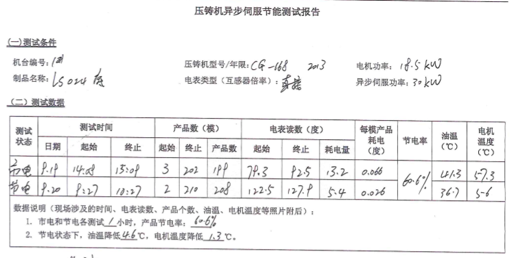 报告一:168T压铸机(电机18.5KW)每小时省电7.8度