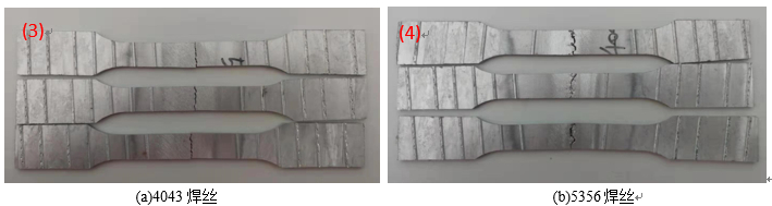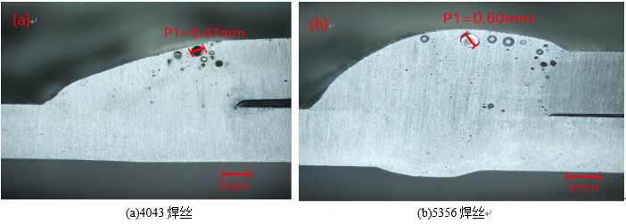 表3:真空压铸铝合金减震塔(改善后)本体取样力学性能 3.2 焊接性能检测 对减震塔本体取样进行MIG焊接,焊丝采用ER4043和ER5356两种焊丝,对焊接接头进行拉伸测试和宏观金相观察。焊缝接头的力学性能检测结果见表4。可见,保留焊缝余高时,采用ER4043焊丝的焊缝接头的平均抗拉强度为150.93 MPa,接头强度系数达到母材的69.82 %;采用ER5356焊丝的焊缝接头的平均抗拉强度为163.91 MPa,接头强度系数达到母材的75.82%;打磨掉焊缝余高时,采用ER4043焊丝的焊缝接头的平均抗拉强度为149.67 MPa,接头强度系数达到母材的69.23%,采用ER5356焊丝的焊缝接头的平均抗拉强度为164.67 MPa,接头强度系数达到母材的76.17%。可见,采用ER5356焊丝焊接比ER4043焊丝焊接接头静载工况下性能更优,采用ER5356焊丝能满足焊接接头强度系数大于70%的要求。从焊缝接头拉断形式看,当保留余高时,两种焊丝焊接焊缝基本断裂在熔合区,这可能是由于在铸件熔合区Fe元素偏聚,形成了Al-Fe-Si等富Fe相,削弱接头处熔合区的性能所致;当打磨掉焊缝余高时,两种焊丝焊接焊缝基本断在焊缝区,这是由于焊缝中心位置为最后凝固冷却的位置,此处应力较大,偏析严重,没有余高增强后,此处为最弱的区域。对铸件焊接后的断面气孔进行了观察,见图7,可见两种焊丝焊接后气孔数量及尺寸相差不大,最大气孔尺寸在0.5 mm左右,基本满足使用要求,但也存在进一步优化的空间。