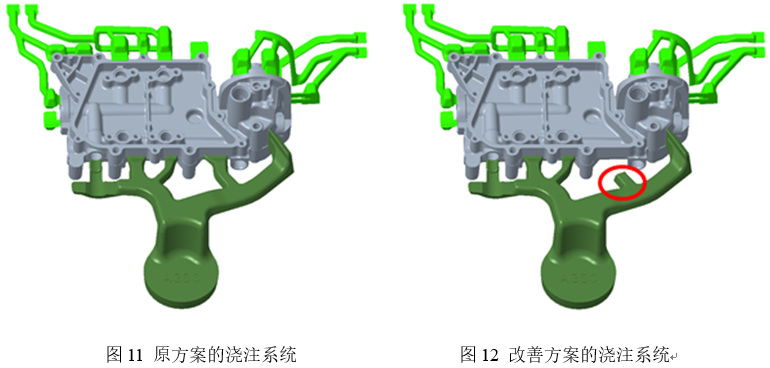3.2 缺陷的改善措施 根据以上分析,解决零件的漏气缺陷必须解决高热节与高气压的问题。解决热节引起缩孔的最佳方法是采用局部挤压,但该漏气区域范围大、产品形状比较复杂,不能采用该工艺。只能通过改善冷却系统的冷却效果来解决高热节问题。具体措施:把零件漏气区域的模具相应位置的两条直冷改为7根单独的点冷,每条点冷单独控制水温与流量,大幅提高该区域的冷却效率,见图9和图10。另外,为了降低缺陷位置的气压和加强增压补缩能力,把靠近缺陷位置的内浇口截断,见图11和图12。