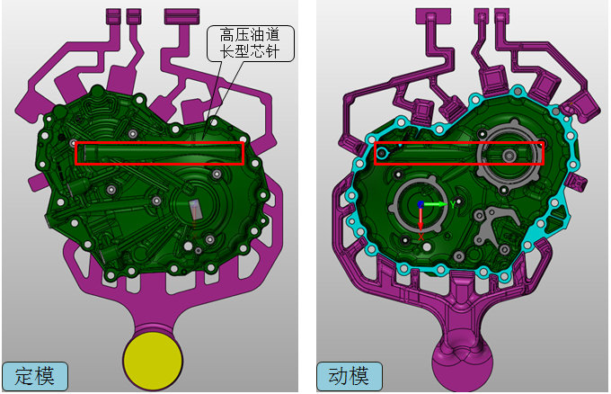 表1 压铸工艺参数方案对比 结果发现,方案1,X光探伤50件,合格28件,合格率为56%;高压油道长抽芯针表面无烧伤有粘铝。方案2,X光探伤50件,合格43件,合格率为86%;高压油道长抽芯针表面无明显烧伤粘铝。方案3,X光探伤50件,合格40件,合格率为80%;高压油道长抽芯针表面烧伤粘铝严重。方案4,X光探伤50件,合格50件,合格率为100%;高压油道长抽芯针表面无烧伤粘铝。 经过对以上4种方案调试验证,在保证铸件内部品质的同时,又要保证长抽芯针表面外观,最优的参数:铝液温度为660 ℃,模具温度为150 ℃,喷涂时间为17 s,冷却时间为11 s。 2、模具结构 高压油道长抽芯针结构主要包括长抽芯针定位结构、针与针套配合结构、长抽芯针高压点冷结构。 2.1长抽芯针定位结构 长抽芯针定位结构见图3。可以看出,长抽芯针用T型连接结构(长抽芯针与连接杆是配合连接)不会导致针向前造成壁位薄;长抽芯针进入型腔位置有面限位保证长抽芯针成形长度尺寸,不会出现过程抽心向前移动的情况;长抽芯针有前后两个部件定位,不会出现长抽芯针的抽离和插入动作的偏摆。因此,此长抽芯针定位稳定,在生产过程中造成抽芯针偏摆的可能性较小。