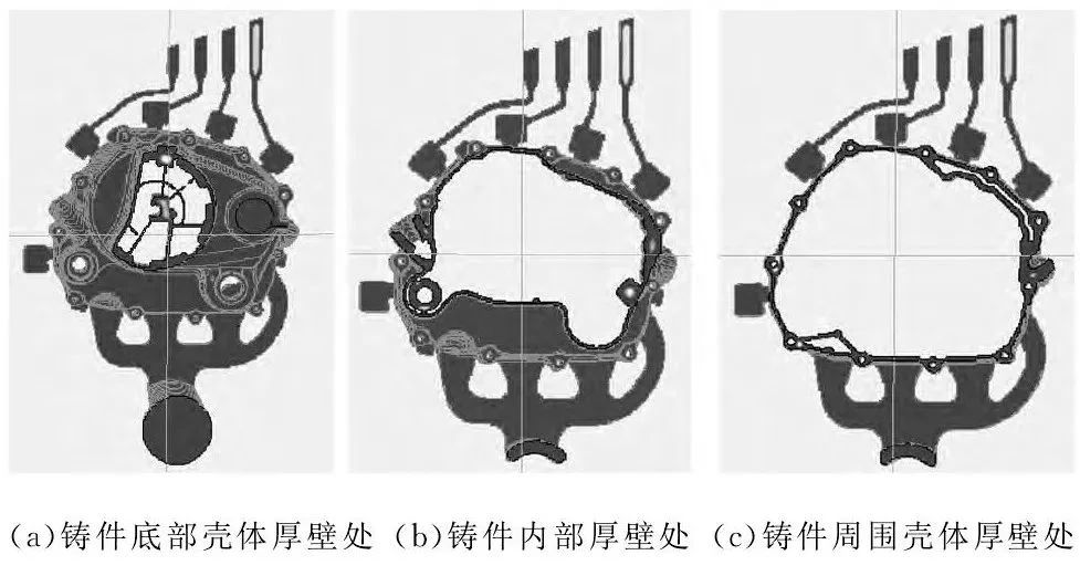 表4 试验结果直观分析表 由图6可见,在铸件壁厚较大的部位出现了缩孔、缩松缺陷,这主要是因为这些部位壁厚不均而产生金属液聚集的热节。由于在高压状态下镁合金压铸件凝固时产生的缩孔、缩松与铸件的形状结构有关,缩孔、缩松一般发生在薄、厚壁相连区的厚壁侧。铸件厚薄不均时,凝固速度不同。壳体处较薄,先于厚壁区凝固,此时厚壁处难以得到外部合金液的补缩,因此铸件缩孔将集中出现在金属液最后凝固及金属液积聚的热节处。