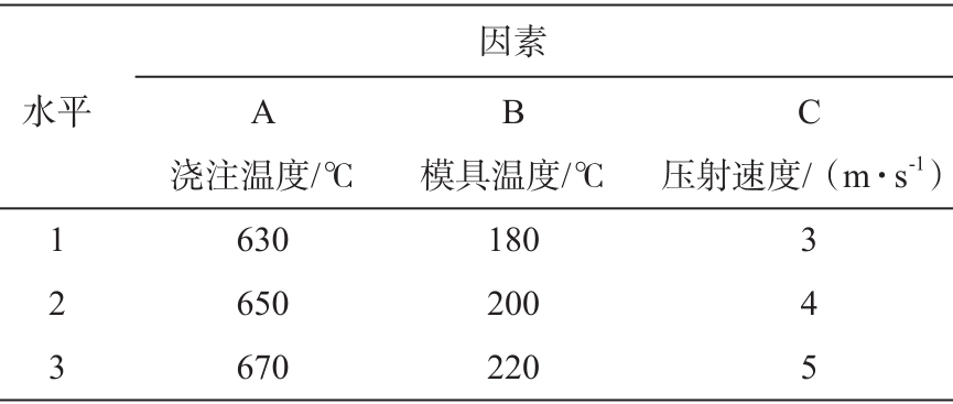 图7 缺陷预测结果 铸件内部缩孔的分布如图7b所示。由图可知,缺陷分布与对铸件凝固过程分析一致,铸件内的缩孔大部分集中在壁厚最厚处,少部分在右侧上端支架与底部圆筒处。使用VE软件对铸件缩孔体积进行测量,缺陷体积约为3.146 cm³,由于铸件右侧上端支架与底部圆筒处为零件质量要求较高处,不允许内部存在缩孔缺陷,因此需要通过优化压铸工艺来消除缩孔缺陷。 3、压铸工艺参数优化 3.1 正交试验方案设计 本研究选取浇注温度、模具温度、压射速度作为正交试验中的主要影响因素,设计了正交试验的因素-水平表,如表2所示。