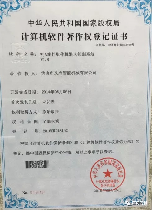 ![]() 发明专利 技术研发、技术创新是企业保持领先和立足于不败的法宝。通过持续的技术研发,企业可以不断推出符合客户需求、有竞争力的产品。佛山市文杰智能机械有限公司系压铸线性机器人领域的领军企业,公司是行业最早实现压铸线性机器人规模化生产的企业,也是推动该领域技术进步的中坚力量。 佛山市文杰智能机械有限公司(“文杰智能”)董事长杨杰先生表示:“多年来,文杰智能持续不断推出高效稳定的线性机器人,从第一代到第四代,从轻型到重型的设备,从四轴到七轴机器人,从单一的取件或喷雾,到喷雾、取件、镶件等多功能的机型,取得不俗的成绩。这些都有赖于我们持续不断的研发投入和技术创新。” 杨杰先生表示:“通过我们的带动,目前压铸产业形成了独有的线性机器人专业领域,吸引了一批自动化设备企业投身于线性机器人事业。作为行业的先行者,我们始终在行业肩负起引领者的角色,多年来投入大量的资金于基础技术及前沿技术的研究,掌握了许多软硬件的技术专利。” 据介绍,文杰智能“WJA线性取件机器人控制系统VI.0”、“WJA线性压铸机器人控制系统VI.0”、“WJA线性搬运机器人控制系统VI.0”软件程序,获得《计算机软件著作权的登记证书》。同时,公司的“一种压铸用线性机器人的串联升降臂”、“一种压铸用线性机器人的导轨防护装置”获得国家实用新型专利。