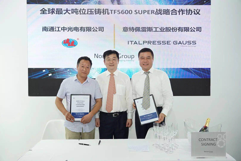 ![]() 南通江中光电有限公司经理郭垂宏先生(左)、诺瑞肯集团亚太区高级副总裁魏宝华先生(右)现场签约。沈阳铸造研究所有限公司董事长娄延春先生(中)亲临见证签约。 中光电携手诺瑞肯集团签订战略合作 2019年7月17日,南通江中光电有限公司与诺瑞肯集团在“2019中国压铸展”首日,成功签约目前全球最大吨位的意特佩雷斯高斯压铸机TF 5600 SUPER以及战略合作协议。 在现场雷鸣般的掌声中,南通江中光电有限公司经理郭垂宏、诺瑞肯集团亚太区高级副总裁魏宝华作为双方代表洽谈愉快,表达了建立长久合作的良好愿望。中国机械工程学会铸造分会理事长娄延春作为特邀嘉宾见证了本次签约仪式。 南通江中光电有限公司创办于1992年,拥有国际先进压铸设备生产线和金属加工设备,专业从事铝合金电梯配件、扶梯配件的生产。产品配套应用于国内外电梯行业知名品牌,是电梯、扶梯行业铝合金配件最全的厂商之一。目前工厂中有3台意特佩雷斯3300吨的高压压铸机,是诺瑞肯集团的忠实用户。