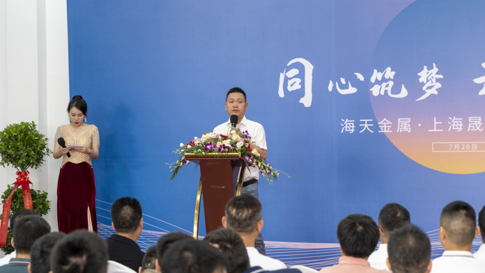 上海晟朔总经理王猛致辞 现场,上海晟朔总经理王猛向前来支持开业典礼的各界朋友、客户与合作伙伴表示感谢,并发表致辞:感谢海天金属为我们提供如此广阔的发展平台,作为海天金属的销售代理商企业,我们定不负使命,充分利用好产业优势、市场资源,不断提升服务质量,为客户提供最高性价比的压铸机产品及成套解决方案!