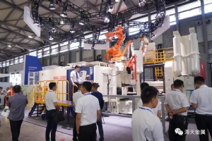 海天金属在中国国际压铸展上携全场最大吨位压铸机HDC1300-RTC冷室压铸机亮相全场,并与现场的取件机器人、喷雾机器人、给汤机、去渣包机形成联动,组成自动化生产单元。