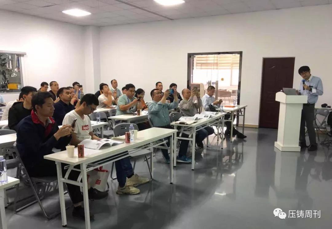 新台通商总经理邱坤彰先生发言 随后,研习会正式开始,第一天的报告主题包括:压铸产业概述,锌压铸件流纹分析和切线型流道设计,超高速/超低速/高精度铝压铸技术与特殊功能运用,工业4.0压铸数据管理系统中旧机与新机集中数据管理案例,高品质省能源铝汤溶解技术,高品质熔汤处理技术,铝压铸模具设计与不良对策,高品质压铸进阶技术与设备:点冷系统/局部挤压铸造/PF吹氧真空铸造等。