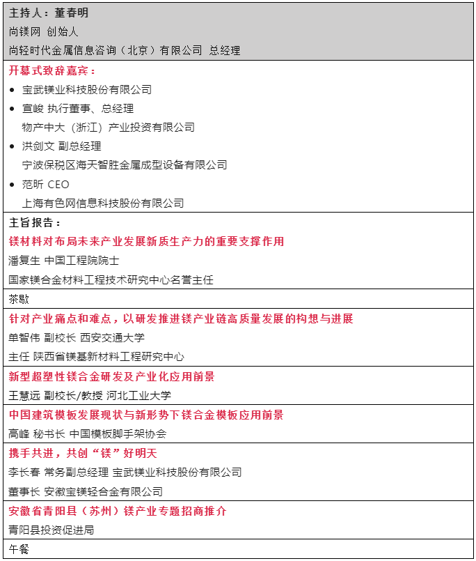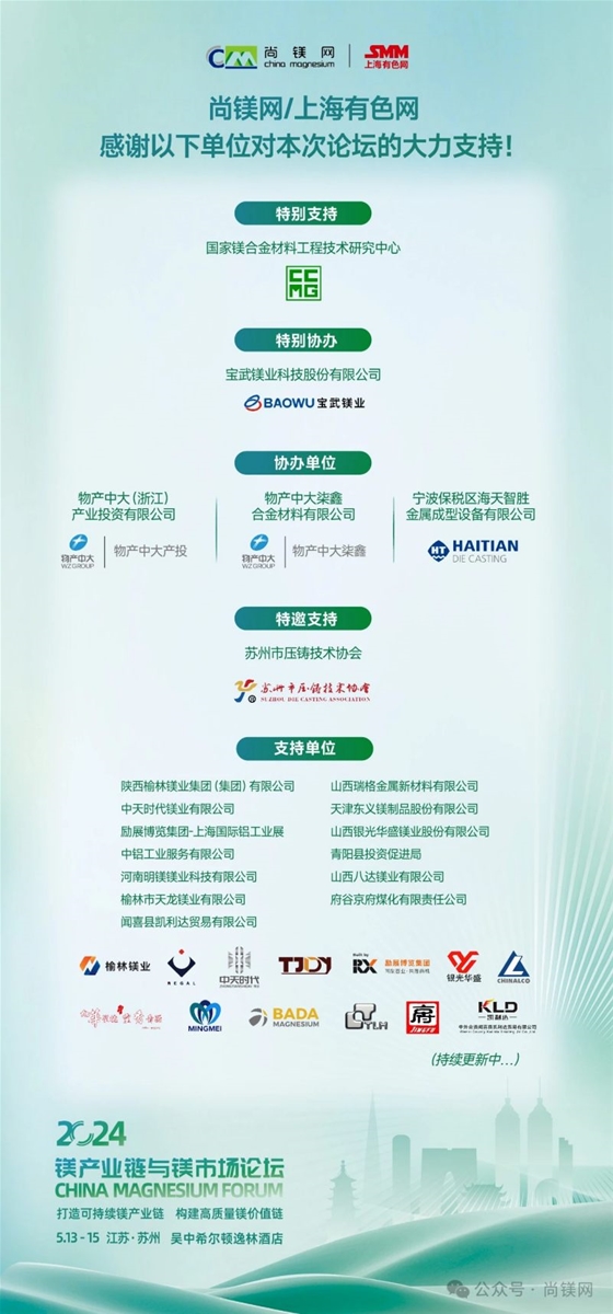 论坛的首要亮点是聚焦镁产业热点议题和前沿科技。论坛期间,将安排24篇主题报告。中国工程院院士、国家镁合金材料工程技术研究中心名誉主任潘复生将做主旨演讲,他将围绕“镁材料对布局未来产业发展新质生产力的重要支撑作用”做高端分享。演讲嘉宾有来自国内一流镁合金研发机构和团队的领军科学家,包括重庆大学、上海交大、西安交大、河北工业大学、湖南大学、郑州大学;有来自国内外镁及镁合金产业链领军企业宝武镁业、宝钢金属、中国一汽、中车四方、上汽集团、中铝公司、物产中大柒鑫合金、海天智胜金属、镁瑞丁轻量化、海镁特镁业、银光华盛镁业;有来自镁产业相关协会和机构的负责人和专家,包括国际镁协、欧洲镁研究协会、中国模板脚手架协会、青阳县投资促进局、尚镁网、上海有色网等。演讲内容涉及镁业市场与形势分析、低碳高效镁冶炼加工技术、镁合金开发与应用案例分享、镁合金材料进展、镁业可持续发展、镁业公司战略等。演讲人均为行业知名专家和领军企业高管,分享的都是镁及镁合金前沿科技和最佳产业实践,契合当前产业化实际和行业热点、焦点议题。 论坛的第二大亮点是设立展区,集中展示镁产业链创新成果 论坛期间还将开设展示区,将有30多家镁产业链企业现场展示其最新开发的镁合金产品、先进加工技术和装备、原辅材料等。目前已经确定参展的知名企业包括:宝武镁业、银光华盛镁业、八达镁业、物产中大柒鑫合金、海天智胜金属成型设备、山西瑞格金属新材料、中天时代镁业、天津东义镁制品、中铝工业服务、河南明镁镁业、闻喜县凯利达贸易、洛阳迈格镁业、山东天镁科技、考迈托挤压科技、宁波鑫林模具、郑州建信耐材、陕西轻特镁科技、德国驶多飞集团、励展集团、华晓精密工业、路飞镁业、恩德森新材料、濮阳名利石化机械设备、微旷科技、中天锐能耐火材料等。 论坛期间还将举办社交活动,为镁产业链各方创造深入交流与合作的机会。 论坛的第三大亮点是产业链上下游人士集聚,共建上下游合作新平台。 为有利于交流,营造良好的镁应用环境,主办方对镁合金终端用户、品牌商、整车厂参会人员免费或提供优惠参会名额,以提高论坛的参与度和实效性。主办方与协办方、支持单位已经协同发出定向邀请。 目前,定向邀请镁合金终端用户和品牌商免费参会的举措也已经取得积极进展。目前已经确认参会的部分镁合金终端用户企业包括:上汽集团、中国一汽、东风汽车、蔚来汽车、小米汽车、陕汽集团、比亚迪、智己汽车、质子汽车、北汽集团、北汽福田、戴姆勒奔驰、通用汽车、小鹏汽车、爱驰汽车、极氪汽车、本田汽车、宁德时代、联想、惠普、爱立信、华为终端、奇瑞汽车、吉林宏凯专用车、上汽变速器公司、泛亚汽车技术中心、上汽乘用车、上海捷能汽车技术公司、捷安特、中车四方、中车大连、雅迪、萌大圣、喜德盛、氢枫能源、中国航天、中国兵器、中航工业、三菱等......可以明显感到,小到电脑、手机、工具、门锁、眼镜,大到高铁车辆、汽车、航空航天器,终端用户和品牌商对镁合金的关注度正在明显提高。 从目前已经注册的的代表看,具有广泛性和代表性,镁及镁合金骨干企业多数都将到场参与交流,包括宝武镁业、物产中大柒鑫、榆林镁业集团、京府煤化、陕西三忻集团、海镁特镁业、神木江泰、神木鑫庆、八达镁业、银光华盛镁业、瑞格金属、天龙镁业、山西东义、颐和镁业、漠源镁业、金川镁业、方正镁业、龙钇重稀土、美特镁业、府谷泰达镁业、府谷新田镁合金、正能化工集团等;变形镁合金加工企业几乎都将到场,包括中铝轻研、中铝洛铜、河南明镁、中天镁业、山东天镁新材料、天津东义、镁孚科技、洛铜集团、迈格镁业、泰特镁业、鼎泰轻合金、镁宇科技、银河镁业、宝玛克科技等;知名镁合金压铸和零部件企业也将与会,如镁瑞丁轻量化、宝镁科技、中信戴卡、富士康、法雷奥、宜安科技、均胜汽车、汇川联合动力、一汽富维、银光钰源、华孚精密、吉文金属、路飞镁业、航天风华、西安航空制动科技、德威股份、盐湖特立镁、飞兴金属、伟时电子等;部分知名镁及镁合金生产加工装备企业、原辅料企业也将与会,如海天智胜、考迈托挤压装备、鑫林模具、劳和镁熔炼技术公司、福来压铸机、中铝工服、凯利达、科达洁能等;包括国内知名研发机构,如中色科技、中铝沈阳院、西安有色院、中国恩菲、有研科技集团、清华大学、北科大、重庆大学、西安交大、上海交大、河北工大、郑州大学等。 目前,论坛主办方尚镁网和上海有色网两个业界有影响力的信息平台和15家协办、支持方正密切合作,继续邀请镁合金终端客户和投资者与会,镁的朋友圈、镁生态圈还将不断扩大! 从巢湖到太湖,祖国的绿水青山都是我们镁好事业的根基和加油站;从2023到2024,我们初心不变,期待更多。镁科技界、产业链上下游人士将共聚姑苏古城,于春暖花开之际,在江南盛景之间共商镁事,共襄盛举,不负资源禀赋,不负大好春光,搅动起镁合金开发应用的澎湃春潮,以中国金属为中国制造减重,为低碳经济赋能!中国镁科技工作者、产业链有识之士和有理想的企业都志存高远,正精诚合作,携手奔向更辽阔的星辰大海! 2024镁产业链与