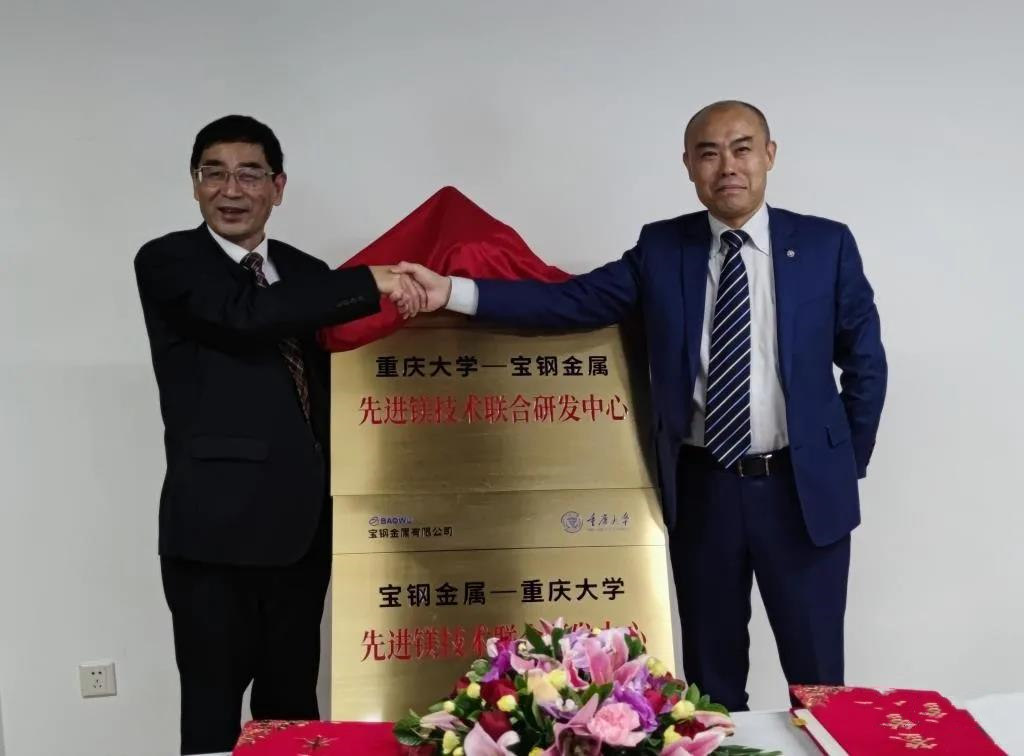 潘复生院士和祁卫东总裁为重庆大学-宝钢金属联合研发中心揭牌 2021年12月26日,重庆大学与宝钢金属共建“先进镁技术联合研发中心”签约暨揭幕仪式在广州举行。双方将充分发挥“先进镁技术联合研发中心”平台作用,结合重庆大学研发优势和宝钢金属新材料发展战略,承担好国家重大战略任务,将镁材料做大做强。