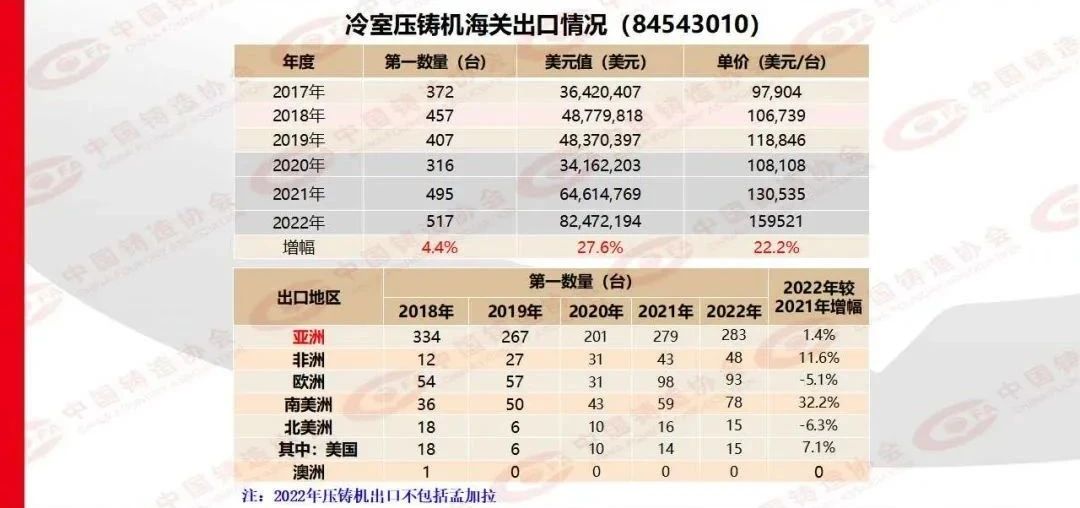 2022年中国铸造行业海关进出口数据显示,冷室压铸机出口517台,同比增长4.4%;冷室压铸机进口169台,同比增长25.2%。其中,进口压铸机中,日本148台,意大利15台,美国1台,斯洛文尼亚1台,中国台湾1台。