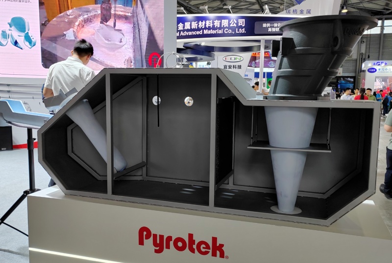 Pyrotek 展示的升液管产品 面对大型一体化压铸这一革命性技术趋势,Pyrotek针对性推出大型定量泵,可实现铝液从保温炉到压铸机的稳定送料,配合定量流槽、加料漏斗、定量升液管等全套配件及耗材,为减震塔、后底盘总成等大型一体化压铸件的量产提供了关键技术支撑,有效解决了传统工艺中零件多、装配难、成本高的痛点。