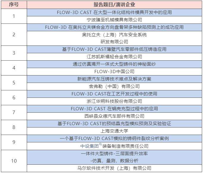 2023FLOW-3D CAST中国用户大会现场 此外,FLOW-3D的软件产品广泛应用于多个行业领域,包括水利环境、海事、航空航天、金属铸造、增材制造、焊接、汽车、能源、微流体、生物技术、涂层和消费品等。而FLOW-3D HYDRO、WELD、AM中国用户大会则面向流体动力、水利环境、航天、焊接、增材制造等行业领域,将于大会前一天(11月21日)举行。 |