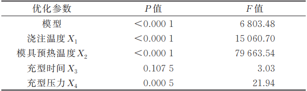 根据上述27组数值模拟结果得到的关于响应指标的响应面模型拟合参数见表5。通过这些参数可以确定拟合度最高的响应面模型。根据拟合参数确定响应指标的响应面模型为二阶响应面模型。表5中的P值、R2和R2adj都是用来判断响应面模型与模拟数据的拟合程度。当P值小于0.05时,可认为响应面模型与模拟数据之间的误差较小。R2为多重判定系数,当R2≥0.8时,可认为该响应面模型可用,R2越接近1,响应面模型的拟合度越高。R2adj为调整后的多重判定系数,通常作为最终判定系数。C.V.为变异系数,若该值大于15%,则需要考虑是否存在异常数据。从表5中可以看出,二阶响应面模型与模拟数据拟合度较好,可以用该模型继续进行响应面试验。 孔隙体积的显著性分析见表6。表6中的P值反映了各优化参数对响应指标的影响显著性。当P值小于0.05时,表示该参数对响应指标影响显著;当P值小于0.01时,表示该参数对响应指标影响高度显著。F值反映了各优化参数对响应指标的影响程度,F值越大,则影响程度越大。从表6中可知,4个优化参数对孔隙体积的影响都是高度显著,其中浇注温度与模具预热温度的影响程度最大。孔隙体积的双因素交互作用三维响应面图见图5。 表5 二阶响应面模型拟合参数