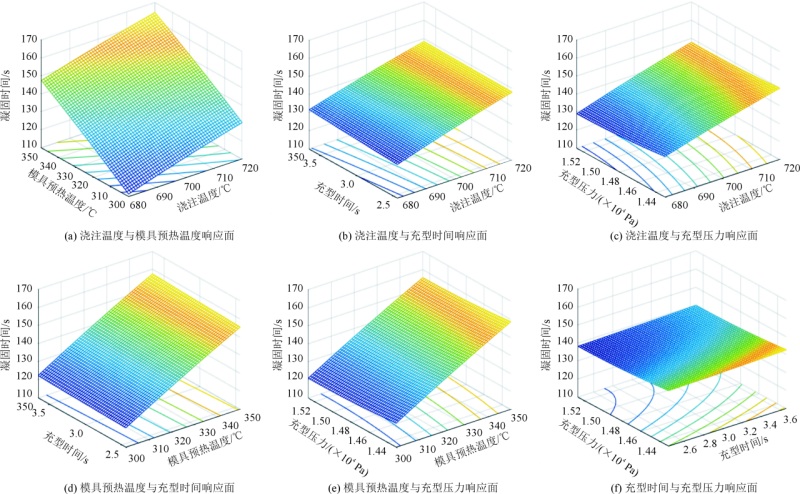 图5 孔隙体积的双因素交互作用三维响应面图 SDAS的显著性分析见表7。从表7中可知,充型时间和充型压力对SDAS的影响程度低于浇注温度和模具预热温度。SDAS的双因素交互作用三维响应面图见图6。凝固时间的显著性分析见表8。从表8中可知,模具预热温度的影响程度最大,浇注温度次之,充型时间的影响程度最小。凝固时间的双因素交互作用三维响应面图见图7。可以看出,温度对凝固时间的影响最显著,浇注温度和模具预热温度越高,凝固时间越长。而当充型时间越长或充型压力越小时,凝固时间随之增加;当充型时间越短或充型压力越大时,凝固时间随之增大。 表7 SDAS的显著性分析