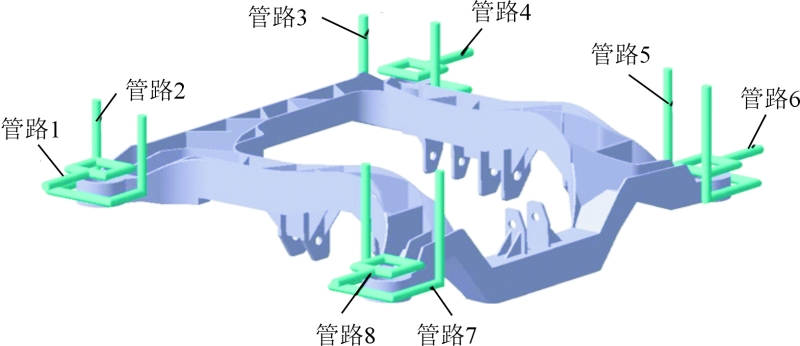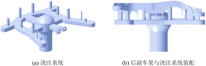 研究对象为某A356铝合金后副车架,其结构见图1。该铝合金后副车架为大型薄壁件,外形尺寸为1 156 mm×873 mm×306 mm,平均壁厚为4 mm,最小壁厚为3 mm,最大壁厚为11.7 mm,质量为16.88 kg。