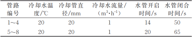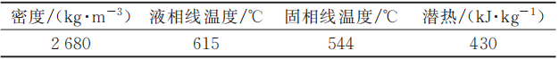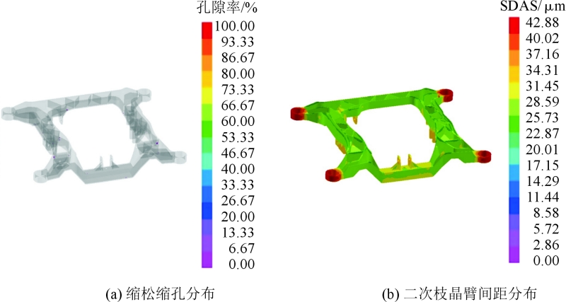 图2 后副车架低压铸造浇注系统 由于铸件外侧的4个圆环状车身安装点的厚度要远大于其余部位处的厚度,在铸造过程中容易在该处产生热节,从而形成缩松缩孔缺陷。所以,在这些部位预先设置了冷却系统,见图3。冷却系统的相关参数设置见表1。 数值模拟所用的A356铝合金的物性参数见表2。在模拟中,设置金属液与模具、金属液与砂芯、模具与砂芯界面传热系数分别为2 000、750和300 W/(m2·K),模具与空气的传热系数为10 W/(m2·K)。 初始方案中浇注温度为700 ℃,模具预热温度为320 ℃。通过ProCAST软件模拟得到初始方案在8.56 s时完成升液,在12.21 s时完成充型,由此可认为压力和时间参数设置合理。根据模拟结果得到初始方案的孔隙体积为0.189 cm3,孔隙率为1.69%,最大二次枝晶臂间距为42.89 μm,铸件完全凝固用时为146.76 s。初始方案的数值模拟结果见图4。