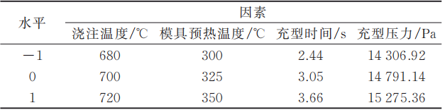 图4 初始方案的数值模拟结果 在低压铸造中,铸件缺陷主要包括气孔、裂纹,缩松和缩孔等。在数值模拟中,通常是将铸件内部孔隙体积,二次枝晶臂间距和凝固时间作为铸造工艺的评价指标。其中,孔隙体积和凝固时间都可以直接得到,而二次枝晶臂间距则需要在view模块中调用result选项中的Metallurgical Tools功能,通过输入金属液的固、液相线温度进行计算得到,一般是以二次枝晶臂间距的最大值作为评价值。另外,低压铸造中涉及到的工艺参数较多,有升液时间、升液压力、充型时间、充型压力、增压时间,增压压力、保压时间、保压压力、浇注温度和模具预热温度等。其中,浇注温度和模具预热温度对上述3个评价指标均有直接影响,而充型时间和充型压力也是影响金属液充型性能的两个重要参数。所以,本研究以浇注温度(X1)、模具预热温度(X2)、充型时间(X3)和充型压力(X4)作为优化参数,以孔隙体积(Y1)、最大二次枝晶臂间距(Y2)和凝固时间(Y3)作为响应指标,通过Design-Expert软件进行三水平Box-Behnken响应面试验设计,并通过试验结果分析各参数对响应指标的影响程度。响应面试验具有精度高、成本低等特点,不仅可以分析单个因素对响应指标的影响,还可以分析双因素对响应指标的影响。此外,响应曲面法还能够处理实际问题中的不确定性和变异性,进一步提高过程优化的可靠性。响应面试验因素-水平表见表3。 响应面试验设计共27组,其中浇注温度和模具预热温度的范围可通过现有研究及生产经验确定。27组试验的数值模拟结果见表4。 表3 响应面试验因素-水平表