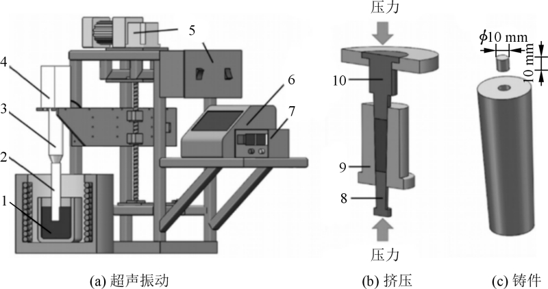 1.熔体 2.超声探头 3.变幅杆 4.超声换能器 5.升降装置 6.超声源 7.温控器 8.顶销 9.固定模 10.上模