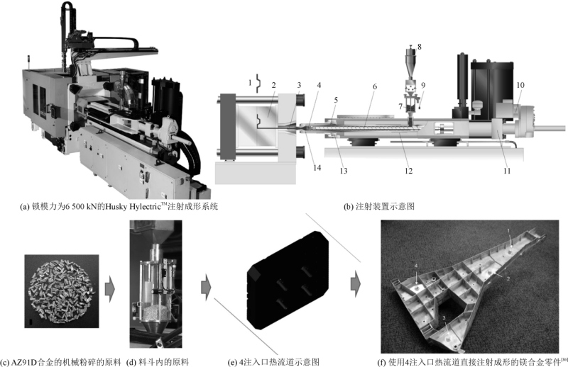 1.产品 2.模具 3.喷嘴 4.止回阀 5.双金属桶 6.螺杆 7.镁屑 8.加料斗 9.保护气体 10.伺服电机 11.高速注射单元 12.加热线圈 13.桶架 14.半固态浆料