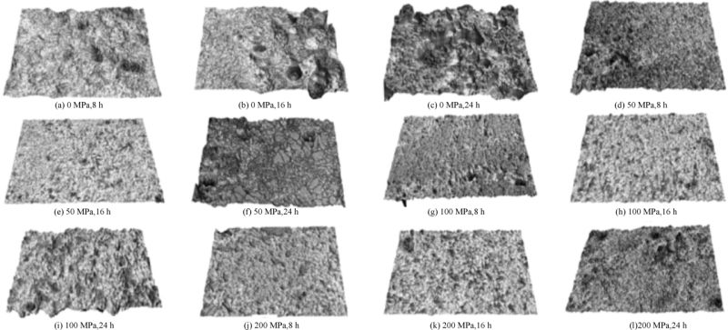 图19 不同压力下RSC试样在不同浸泡时间下的三维腐蚀形貌