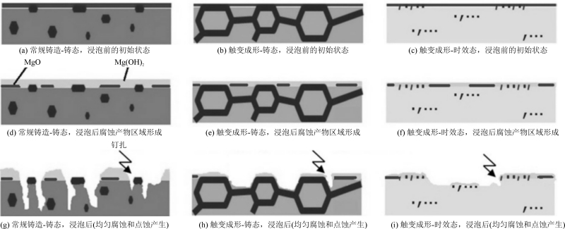 图20 在0.1 mol/L NaCl水溶液中浸泡试验中WE43镁合金表面腐蚀过程的简化模型