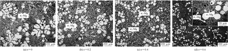 图6 Mg-10Gd-2Ca-xZr(x=0,0.2,0.4,0.6,%)合金半固态浆料微观组织