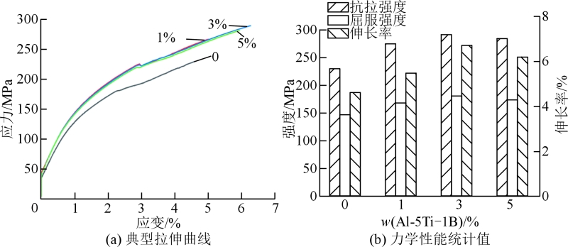 图11 不同Al-5Ti-1B添加量时TiB2/ADC12铝合金的力学性能