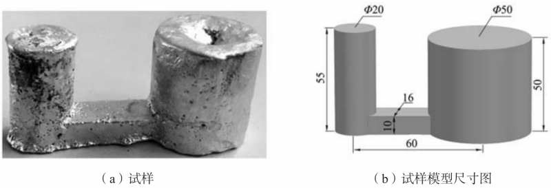 式中:角标i表示x、y、z分量;ds为复合体中渣粒的直径;dp为复合体直径;ui为金属液速度分量;upi为复合体的速度分量;t为时间;ρs为复合体中固体渣的密度;Fpi为金属液内压力梯度传递给复合体的作用力分量;Fgi为复合体重力分量;FDi为金属液对复合体的运动阻力分量;Fbi表示复合体所受浮力分量;P为金属液压力;gi为重力加速度分量;CD为阻力系数。 02 渣气孔的形成及演变分析 2.1 试样结构及浇注工艺 采用砂型重力铸造方法浇注圆柱形试样,底注式结构有利于渣气孔的形成及聚合运动。试样材料为ZL102合金,浇注温度为720 ℃,充型速度为0.3 kg/s。试验中通过外加Al2O3颗粒(40目,密度3.9 g/cm³)来模拟铝液中的外来夹杂物。Al2O3颗粒加入量为1.4 g,折算成颗粒数约为2 000颗,试样及浇注系统形态尺寸如图3所示。