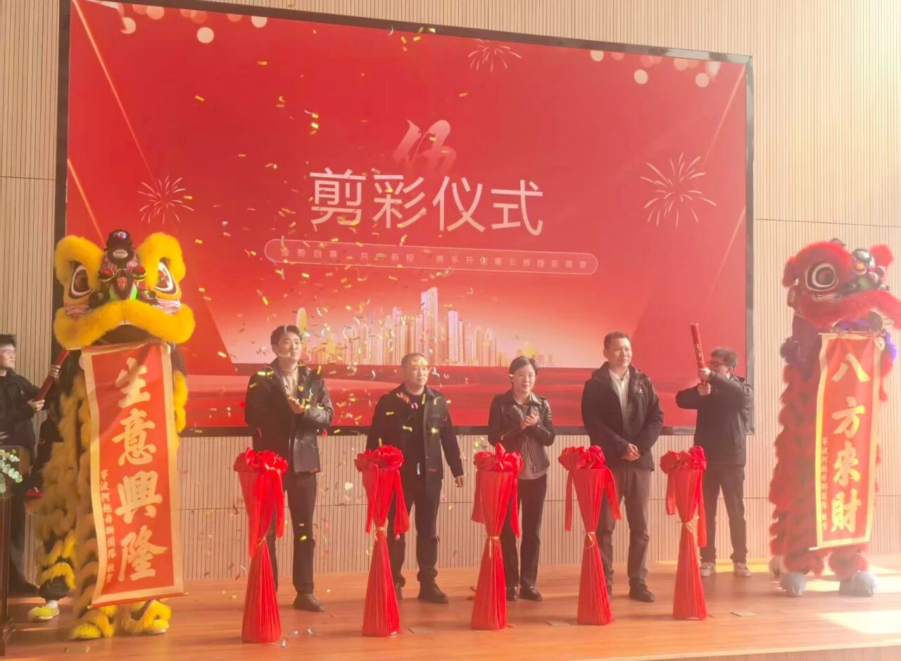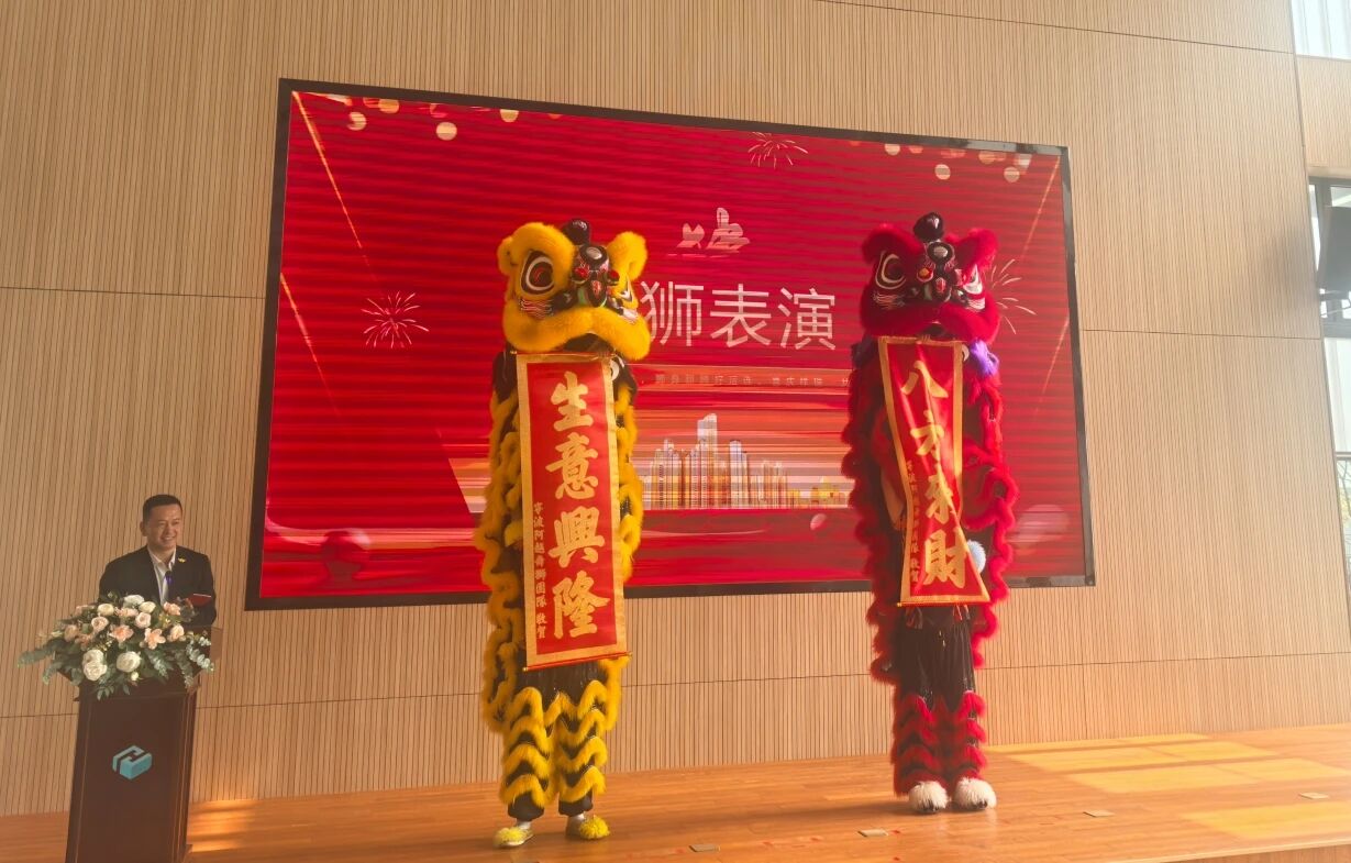 醒狮表演 仪式环节精彩纷呈,传统韵味与科技气息完美交融。威风凛凛的舞狮登台献艺后,象山县投资促进中心胡赛红副主任与慧臻科技刘杜总经理共同为祥狮点睛,“一点左眼开天眼,二点右眼展宏图,三点额头启新程”,寓意着两大新品将以智慧之光照亮智造之路。在热烈的掌声中,胡赛红主任、陈海星副镇长、刘杜总经理等嘉宾共同剪彩,三剪落下,彩绸飞舞、礼花绽放,正式宣告慧臻科技智能制造新征程的全面启航。剪彩过后,全体嘉宾与工作人员共同合影,定格这一历史性时刻。