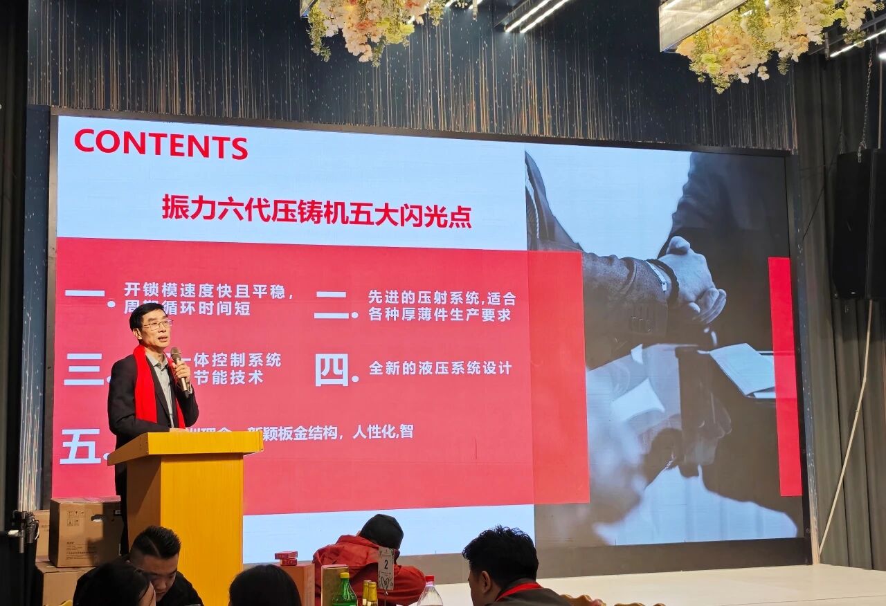 振力机械总工程师惠建学先生作报告 晚会的技术宣讲环节干货满满,为现场嘉宾带来一场行业前沿分享。振力机械总工程师惠建学先生以《振力第六代系列压铸机》为题分享,该机型传承公司二十五年制造经验,契合行业新需求,融合先进机械设计、前沿控制技术及仿真液压设计,是集实力与智能于一体的标杆产品。其核心优势聚焦三大维度:优化机铰结构并搭载 AI 算法,实现开锁模快速平稳、循环周期短且重复精度高;升级压射系统,优化关键部件并采用双控制模式,普通机高性价比、高配机数字化操控,适配各类厚薄件生产;搭载四机一体控制系统与伺服节能技术,提升布局合理性与效率,降低噪音和油温。 此外,该机型迭代液压系统,提高压力、优化管路,采用无焊接联接技术及德国派克液控单向阀,保障运行稳定;融入欧洲设计理念,以新颖板金结构为基础,在关键部位设置多重防护,实现人性化、智能化安全保障。这款汇集多项核心技术的压铸机,将为高精密、高要求铸件生产提供优质解决方案,助力客户创造更高价值与投资回报。