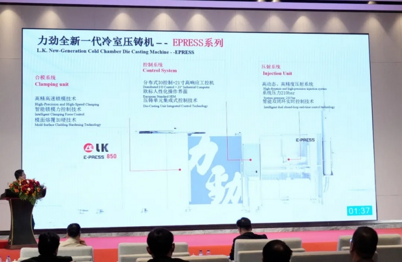 图源:鸿特科技 鸿特科技此前发布公告称,公司计划在泰国投资新建生产基地,以进一步完善其海外战略布局。新建基地项目选址于泰国罗勇府正大(CPGC)产业园,建设内容包括土地购置、厂区建设、设备采购及安装等,主要生产各类汽车铝合金压铸零部件。 力劲EPRESS系列新一代智能冷室压铸单元 据力劲集团消息,11月6日 - 8日,2025年度宁波压铸产业高峰论坛(压铸年会)暨北仑模具科技周活动在宁波举办。大会上,刘稳博士介绍了力劲自主研发的EPRESS系列新一代智能冷室压铸单元,该单元集高精度控制、高动态性能与绿色节能设计于一体。EPRESS系列采用分布式IO控制架构与双闭环实时控制系统,可实现毫秒级动态响应与工艺自适应控制。