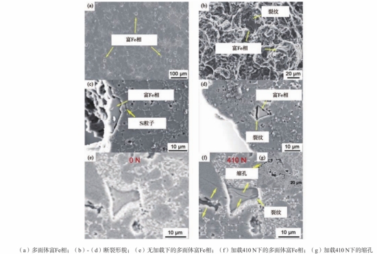 图17 ADC12压铸件不同孔隙率的疲劳S-N线图 3.2 富Fe相对力学行为的影响 在铸造铝合金中,Fe作为杂质元素,其形成主要的金属间化合物会对合金的力学性能产生不利影响。因此,富Fe金属间化合物对合金性能的作用已成为众多研究人员重点关注的对象。为了减轻Fe元素在铸造铝合金铸件中造成的损害,通常会通过添加锰和铬等元素或者提高冷却速率的方法来促进生成致密的α-Fe相。研究结果表明,高含量的锰和铬能够促进α-AlFeSi相的形成,抑制β-AlFeSi相的形核,进而改善AlSi7和AlSiCu合金的力学性能。由于压铸铝合金作为结构件使用时对其力学性能有着较高要求, 作者利用原位SEM研究了合金铸态和T6热处理压铸AlSi10MgMn试样的拉伸行为。在铸态铸件中,尺寸较小的α-Fe金属间化合物上发现了微裂纹,但主裂纹主要通过共晶区扩展。经过T6热处理后,由于固溶和时效处理过程中残余应力的释放,只有较大的金属间化合物发生断裂形成微裂纹。在拉伸过程中,因基体和硅颗粒变形量不同,两者界面处形成了微孔,主裂纹通过连接这些微孔进行扩展。综合上述研究可以看出,富Fe金属间化合物对压铸铝合金的力学性能有着极为显著的影响。 在压铸AlSi合金富Fe相的研究中,Jiao和Xiong等人进一步地研究了富Fe金属间化合物对合金力学性能的影响。他们在断口表面发现了多面体富Fe相,如图18所示。通过对缩孔和硅颗粒以及断口表面多面体富Fe相的应力强度因子进行对比分析,得出了一个重要结论:尺寸较大的多面体富Fe相具备较差的变形协调性,容易成为应力集中源,进而促进了微裂纹的形成与扩展。尽管该研究证实了富Fe金属间化合物对力学性能存在影响,但仍有两点局限性需要考虑。其一,在断口表面观察到的相尺寸和裂纹长度可能小于它们在空间中的实际尺寸,所以计算得到的应力强度因子可能被低估。其二,正如先前的研究所示,聚集的富Fe金属间化合物对主裂纹的扩展有着更为重要的影响,而该研究仅选取了断口表面的单个金属间化合物而未能考虑相邻金属间化合物的影响。