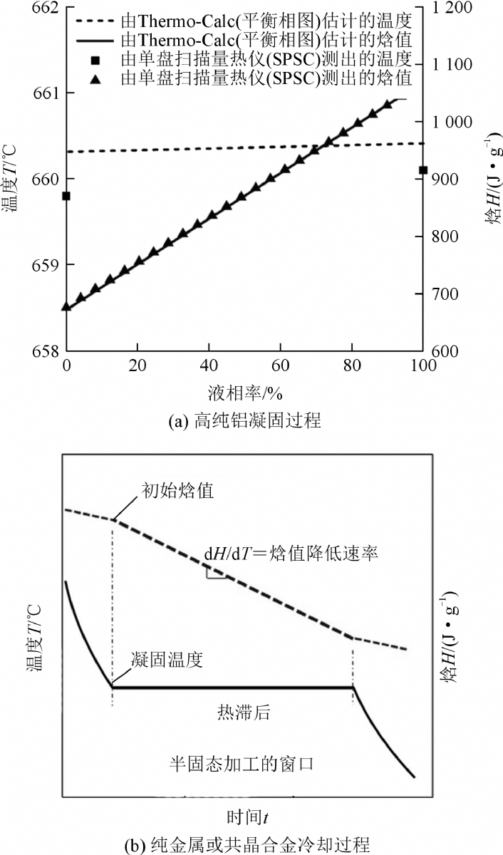 图1 高纯铝凝固过程以及纯金属或共晶合金冷却过程中焓和温度的变化示意图