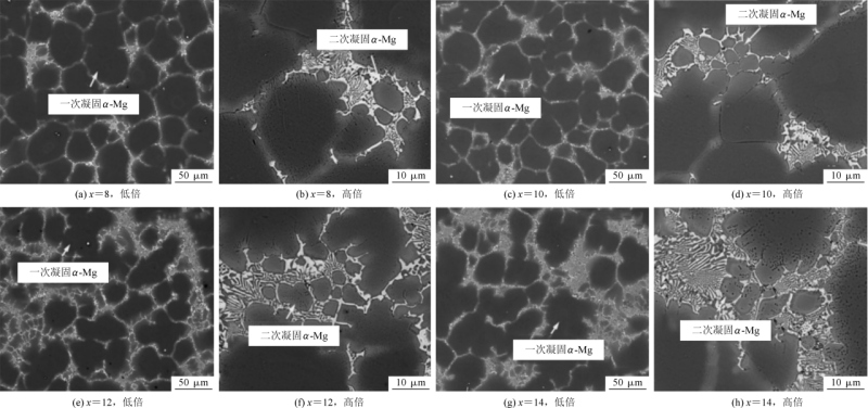 图12 流变压铸 Mg-xGd-3Y-1Zn-0.4Zr (x=8, 10, 12, 14,%)合金铸态的SEM-BSE图像