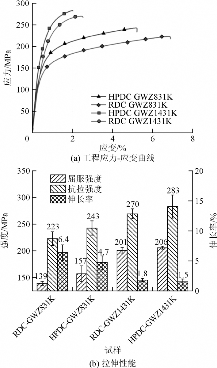 图18 采用RDC和常规HPDC制备的Mg-RE合金的工程应力-应变曲线和力学性能