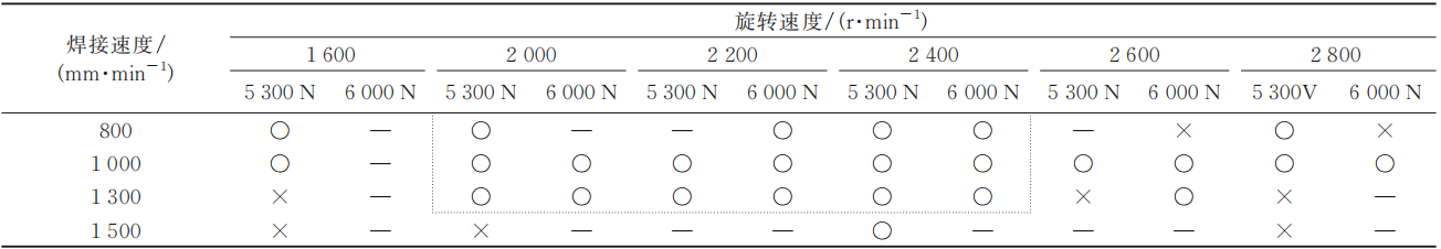 图6 两种轴肩焊具的表面粗糙度和板减量对比 表1 焊接参数验证组合和选用的焊接参数