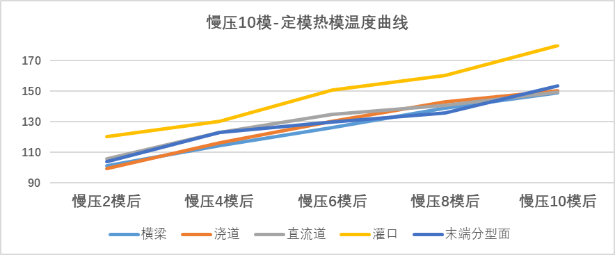 根据前期项目阶段试模的结果以及模具状态评估的经验,热模件数量定义原则是停机超过1小时需要生产10件热模慢压件。 慢压定义的理论依据: 1.在压铸生产前,需要预先将模具加热到一个合适的温度,一般为浇注温度的1/3,与压铸材料有关,一般为100-300℃。 2.模温机定义热模温度为200℃,水温机定义热模温度为130℃。 3.根据热模期间模具温度上升的情况,详见下图热模温度曲线,慢压10模后各个区域的模温可以达到工艺参数要求值范围。