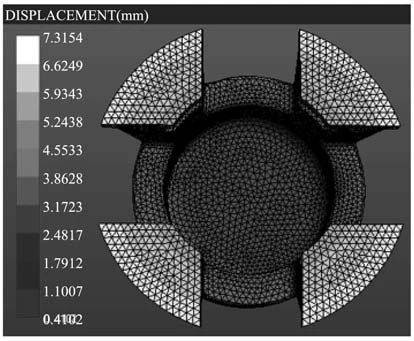 图6 残余熔体模数 在底脚对面位置有2%出现缩孔的概率,此位置为非加工面,不得有缩孔缺陷,因此有必要通过调节温度场来降低缩孔发生的概率。 2.2.5 应变模拟 图7为应变模拟结果。活塞在工作时底脚与地面接触,靠此位置支撑,要求变形量小,结果显示变形量最大为7.3 mm。